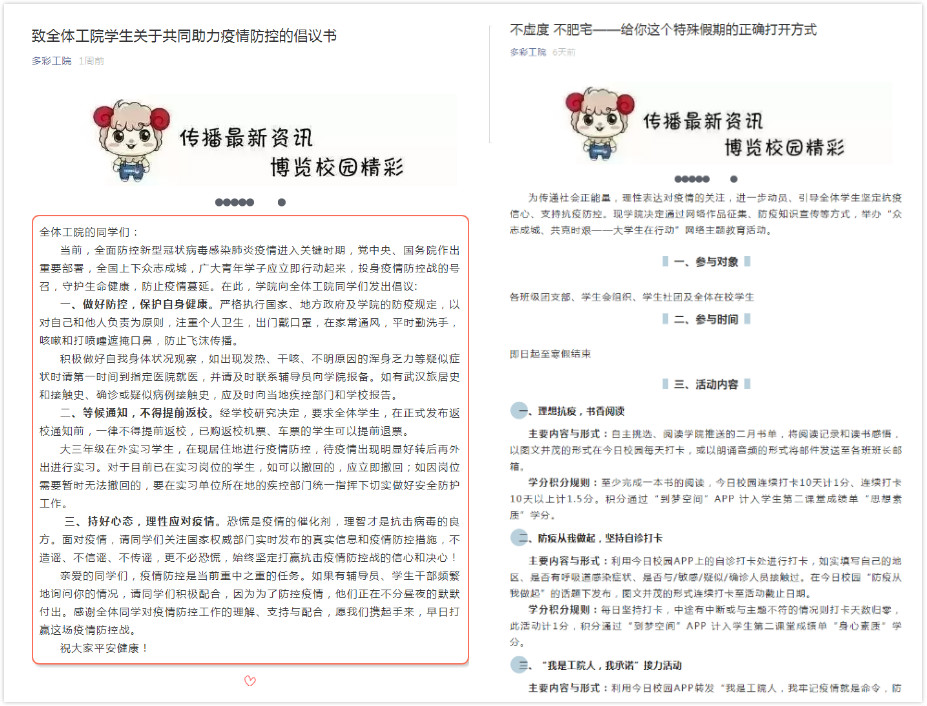 战“疫”有方,网络宣传有实效。疫情防控的关键时期,网络成为连接师生的主渠道,工院学工人依托网络传播正能量,变疫情“危机”为教育“契机”,引导学生不信谣、不传谣,号召学生听党话、跟党走。学工部“多彩工院”公众号上《防控疫情承诺书》给全体工院学子吹响了“疫情防控从我做起”的集结号,“众志成城、共克时艰——大学生在行动网络主题教育活动”号召同学们不虚度、不肥宅,丰富了同学们的假期生活。各系也积极开展各具特色的线上活动:经济贸易系开辟“共抗疫情经贸力行”板块,积极宣传投入到抗疫一线的工院志愿者先进事迹;智能制造学院、汽车工程系开展了“新型冠状病毒知识问答”线上答题活动;环境与化学工程系学子为武汉送上了手写的祝福,用文字的力量为武汉加油;建筑工程系发动“咏经诵典、为爱发声”线上征集活动,以诗歌力量向逆行者致敬;材料工程系开展“停课不停学”学习打卡,用奋发图强投身实际“抗疫”……工商管理系何晓卉老师、计算机技术系陈思老师、汽车工程系李倩老师、环境与化学工程系孟熙扬老师等越来越多的辅导员依托网文开出“抗疫心处方”为同学们释疑解惑、传播正能量,引导学生传播真知,坚定抗疫信心。