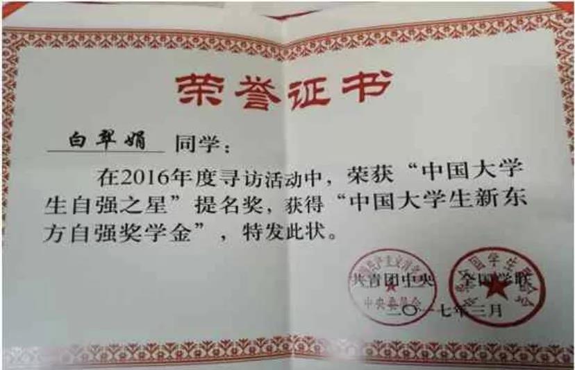 树。以榜样的力量引领前行。大力发掘、培育、宣传团员青年可信、可敬、可学的先进典型。团支部委员白翠娟,因“背起病榻上的母亲,也要坚持完成学业”获得社会和媒体关注,荣获全国大学生自强之星提名奖。另有3人荣获国家励志奖学金,1人获得省三好学生。用学生身边榜样,激励鼓舞学生向榜样学习,健康成长成才。