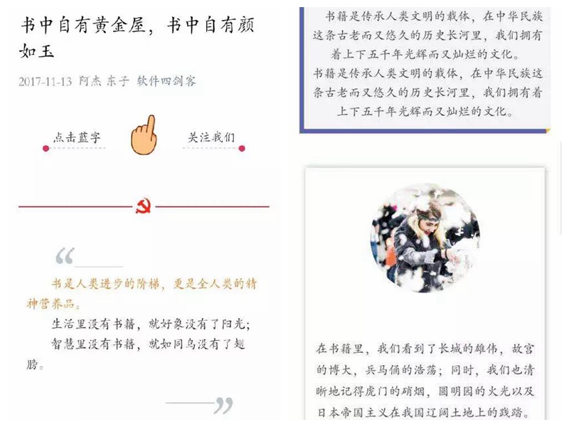 学。开展“青年大学习”行动。把握五四青年节、马克思诞辰200周年、“一二•九”、改革开放40周年等重要节点,通过专题学习、知识竞赛等形式,开展青年学习。拓展网络平台开展线上学习。创立“软件四剑客”团支部微信公号,共推送文章和音视频78篇,开设了十九大精神、新宪法等线上学习窗口,辅助学生理论知识学习。