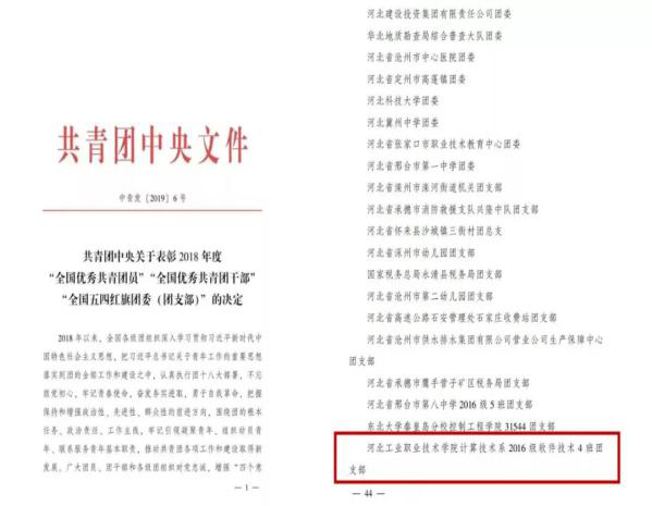 近日,共青团中央发布了《关于表彰2018年度“全国优秀共青团员”“全国优秀共青团干部”“全国五四红旗团委(团支部)”的决定》(中青发【2019】6号)。河北工业职业技术学院计算机技术系2016级软件技术四班团支部荣获2018年度“全国五四红旗团支部”荣誉称号。