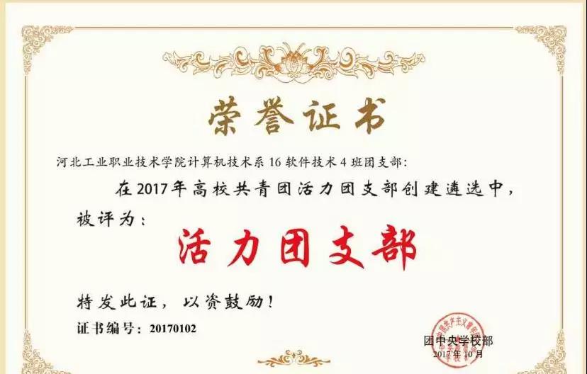 河北工业职业技术学院计算机技术系2016级软件四班团支部在各级党团组织和老师的培养下,始终坚持以习近平新时代中国特色社会主义思想为指导,以“强化组织建设、聚焦青年成长”为团支部、团员共建路径,全面推进“思想引领、组织提升、素质拓展和服务社会”四个方面工作。团支部现有团员52人,16人成为入党积极分子。团支部先后荣获“全国高校活力团支部”以及“省直优秀团支部”等荣誉称号,拥有“全国大学生自强之星提名奖”1人,团支部成员荣获省级以上荣誉十余项。