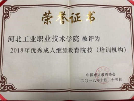 2018年10月,在教育部职成教司督办、中国成人教育协会主办的2018全民终身学习活动周总开幕式上,我院被授予“2018年优秀成人继续教育院校”。