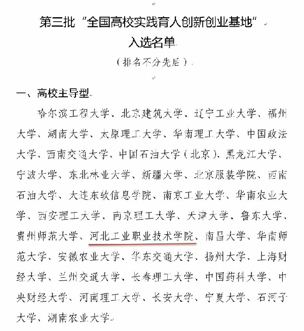 “全国高校实践育人创新创业基地”是教育部、人社部、国资委结合实践育人和国家创新创业战略布局从2015年起共同开展的一项创建工作,旨在通过基地培育建设,提升校企产学研合作,推动高校科技成果转化,实现师生共创,提升学生实习实践能力。2017年共遴选出高校主导型、政府主导型、社区主导型、行业企业主导型四类共50家“全国高校实践育人创新创业基地”,我院赫然在列,是第三批全国唯一入选专科院校和河北省唯一入选高校。