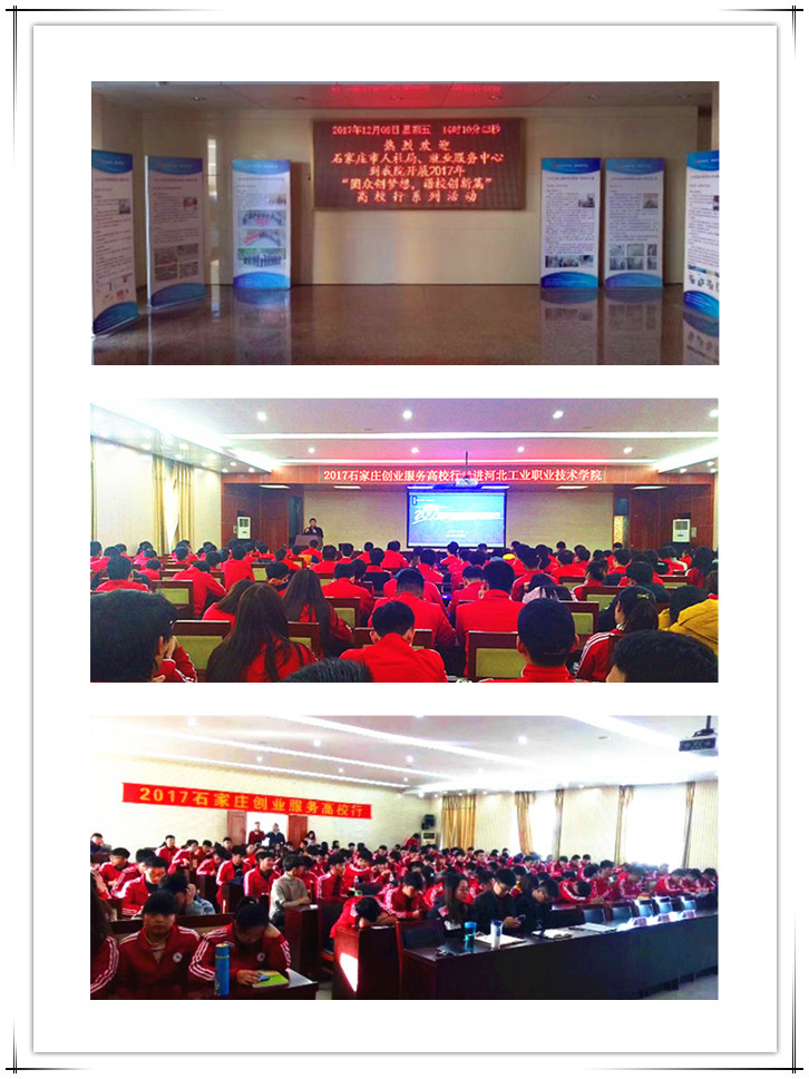 12月9日,由石家庄市人力资源和社会保障局主办,我院招生就业指导中心承办的“2017年石家庄创业服务高校行”活动第15站在学院行政楼五楼报告厅举行。创业名师张珂铭,高校创业指导专家李周男和桥西区就业局培训中心主任王海平作为主讲嘉宾分别从“如何运用商业模式编制商业计划书”、“创新创业对当代大学生的意义”和“当前最新创新创业政策”三个方面做精彩分享,来自全院9系300余名师生参加了此次活动。