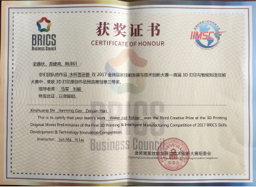 2017年8月26日举办的全国第一届“金砖国家技能发展与技术创新大赛—3D打印造型技术”赛项比赛中,我院机电工程系学生史鑫状、高健鸣、韩泽轩三名学生在马军老师和刘毅老师的精心指导下,原创作品 “水杯固定器”获得创意三等奖。