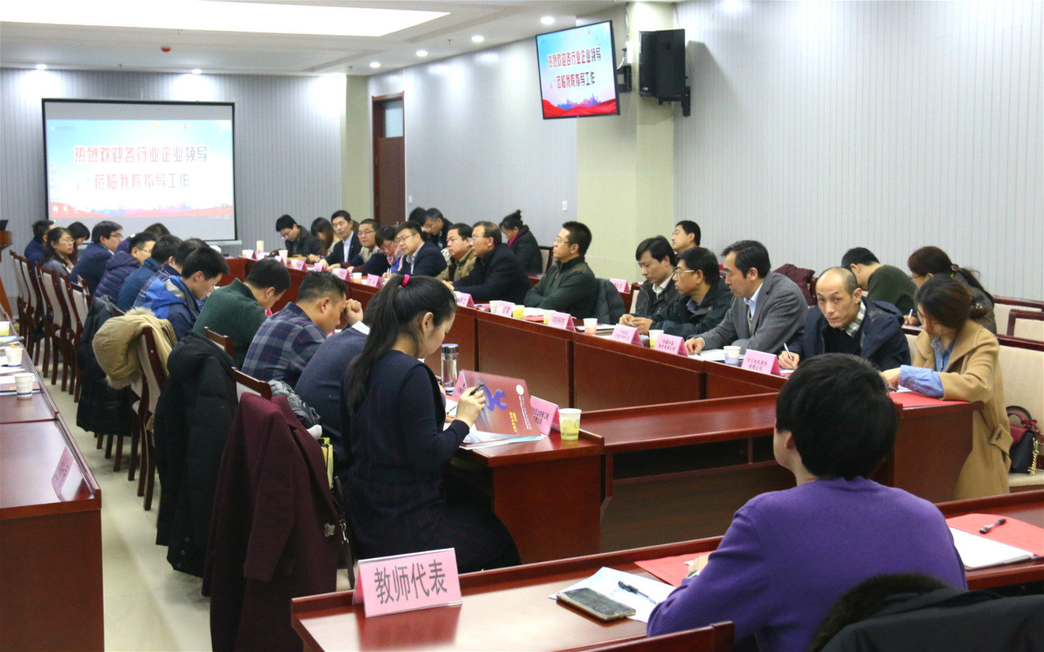 随后,招生就业指导中心(校企合作处)负责人就学院近几年生源质量、生源结构、专业群人数、就业服务与指导、市场建设、就业分析、校企合作模式等方面情况进行了详细介绍。各企业代表介绍了各行业企业目前发展现状、未来企业用工需求情况,并对学院人才培养、教育教学、专业设置、校企合作等方面提出了宝贵的的意见和建议。