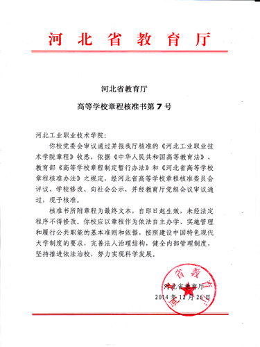 文件指出,依据《中华人民共和国高等教育法》、教育部《高等学校章程制定暂行办法》和《河北省高等学校章程核准办法》之规定,经河北省高等学校章程核准委员会评议、学校修改、向社会公示,并经教育厅党组会议审议通过,《河北工业职业技术学院章程》予以核准。这标志着我院践行依法治校,探索现代大学制度建设,推进内部治理体系和内部治理能力现代化率先在全省迈出扎实而重要的一步。
