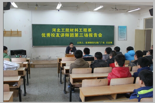 12月25日下午,我院材料工程系举办了“优秀校友讲师团”第三场报告会,此次报告会邀请了河北纵横钢铁集团有限公司轧钢厂厂长王志刚作报告,材料工程系党总支、教师代表以及200余名学生聆听了报告会。