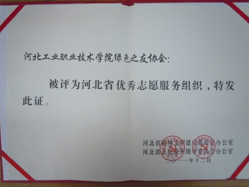 我院“绿色之友协会”创建于2001年,是我院成立最早的的学生社团组织,目前有在校生会员500余人,以宣传环保,倡导绿色生活,创造绿色人文为宗旨,是“中华环保联合会会员单位”和“河北环保联合会会员单位”。十年来,“绿色之友协会”积极活跃于校内外各项环保志愿活动,逐步发展成为河北省知名的高校环保组织,深受广大师生的支持和群众的喜爱。