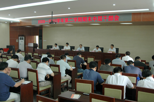 7月10日下午,学院召开2009—2010学年第二学期期末中层干部会。学院党委副书记、院长董兆伟主持会议并作了重要讲话,党委副书记王建刚、常务副院长贾俊礼、副院长李军锁、副院长王世龙出席了会议。学院全体中层干部参加了会议。