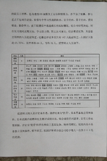 按公司有关规定:结合见习期第一季度测评结果,对见习期表现突出,学习能力强,职工认可度高,综合素质优秀,具备独立顶岗的毕业生予以提前转正。经首钢迁钢公司基层评议,在见习期第一季度测评“优秀”的186名毕业生中,共有142名毕业生(本科66人;专科76人)可以提前转正,在我院被评定为“优秀”的27名毕业生中共有15人达到了提前转正的资格。