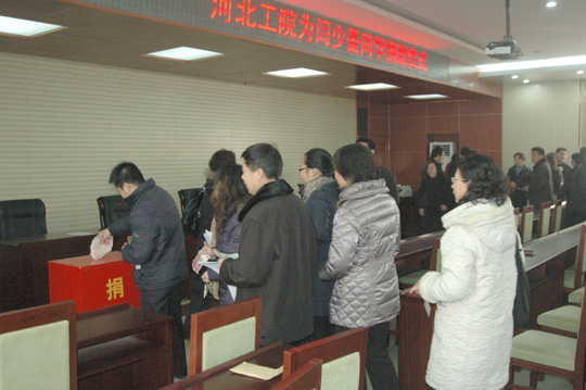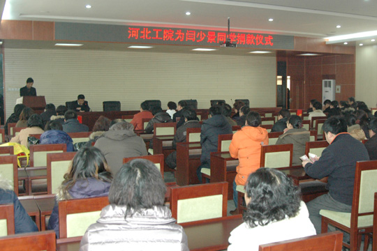 学院机关处室和系部教师已早早就坐,大家热切地关注着闫少景同学伤后治疗情况。2点30分,王世龙副院长宣布捐款活动开始,院党委副书记王建刚宣读《捐助倡议书》,代表学院党政领导对默默关心和帮助闫少景、勇于奉献爱心的师生们表示由衷的感谢!号召大家铭记明德、团结、自强的校训,发扬乐善好施、扶贫帮困的中华民族传统美德,伸出友爱之手,献出关爱之情,帮助闫少景早日康复并重返校园。大家自觉排成长队,把自己的爱心、期望和祝福投入红红的募捐箱……