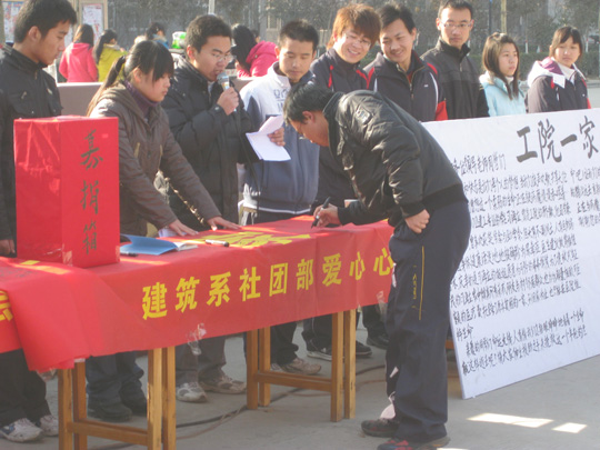 命运无情,人有情,工院师生献真心。得知这一消息后,河北工院全体师生立即行动起来,上至学院领导,下至普通同学纷纷慷慨解囊,伸出援助之手来挽救这一年轻的生命。建筑工程系爱心心理协会在南院学生公寓举行了为期三天的爱心募捐活动,建筑工程系团总支、学生会精心组织了“工院一家亲——大型捐款仪式”,这一系列募捐活动也同时得到了材料工程系、机电工程系等系的大力支持。一次次爱心奉献、一幕幕感人画面,让我们看到了人间至爱真情。大家正把爱心与力量汇集起来传递给正在与病魔做抗争的习海立。