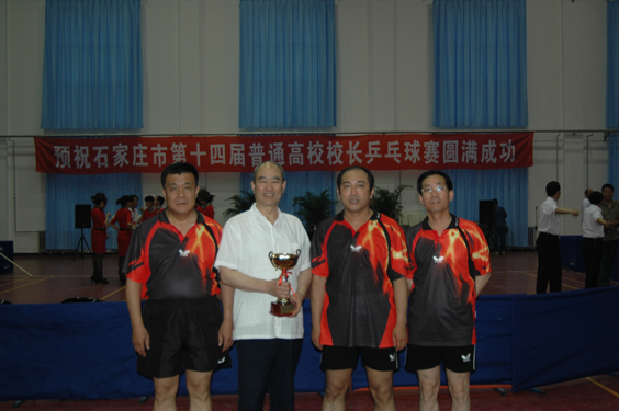 我院由郑双起书记、董兆伟院长、李军锁副院长、王世龙副院长组成的乒乓球代表队在本次比赛预赛阶段中,以小组第一的身份进入决赛阶段,最终取得石家庄市第十四届普通高校校长乒乓球赛第二名的优异成绩。