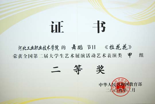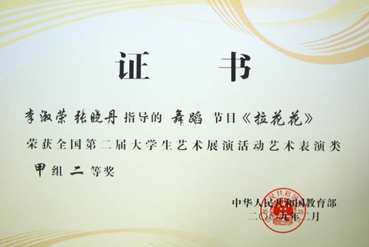 近日,由教育部主办的全国第二届大学生艺术展演活动落下帷幕,我院取得优异成绩。教育部授予我院“全国第二届大学生艺术展演活动优秀组织奖”荣誉称号;由李淑荣、张晓丹指导的舞蹈节目《拉花花》荣获本届艺术展演活动艺术表演类甲组二等奖。 全国大学生艺术展演是教育部根据《学校艺术教育工作规程》举办的全国性大学生艺术比赛,每3年一届。举办该活动是为了提高大学生的人文素养和审美修养,展现当代大学生积极向上的精神风貌,展示我国高等学校艺术教育的成果,推动高等学校艺术教育的改革与发展。本届展演活动从2007年开始启动,活动以“我和祖国”为主题,分为艺术表演类、艺术作品类、高校校长书画摄影作品展和高校艺术教育论文报告会四类活动内容。
