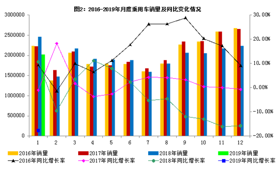 2019年1月,汽车产销量同比明显下降,降幅均超10%,大多数车型产销水平均低于上年同期。