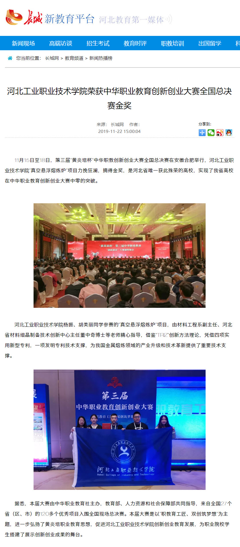 11月15日至18日,第三届“黄炎培杯”中华职教创新创业大赛全国总决赛在安徽合肥举行,河北工业职业技术学院“真空悬浮熔炼炉”项目力挽狂澜,摘得金奖,是河北省唯一获此殊荣的高校,实现了我省高校在中华职业教育创新创业大赛中零的突破。