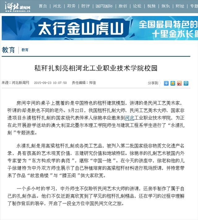 9月22日,我国秸秆扎刻大师、民间工艺美术大师、国家非遗项目永清秸秆扎刻的国家级代表传承人徐艳丰应邀来我院为正在此开展游学活动的澳大利亚墨尔本理工学院师生与建筑工程系学生进行了“永清扎刻”专题讲座。当日,建筑工程系还特聘徐艳丰大师及其传人徐健为建筑工程系“国家级非遗项目秸秆扎刻进校园”导师。河北日报、河北新闻网对此活动进行了报道,随后,光明网进行了转载。