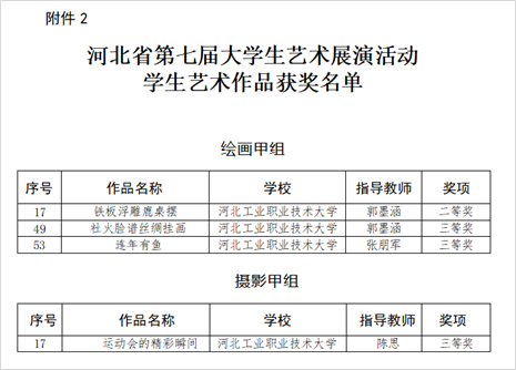 近日,河北省教育厅发布《关于公布河北省第七届大学生艺术展演结果的通知》,幻影体育(中国)官方网站选送的绘画作品铁板浮雕《鹿》获二等奖、《社火脸谱丝绸挂画》《连年有鱼》获三等奖、摄影作品《运动会的精彩瞬间》获三等奖。