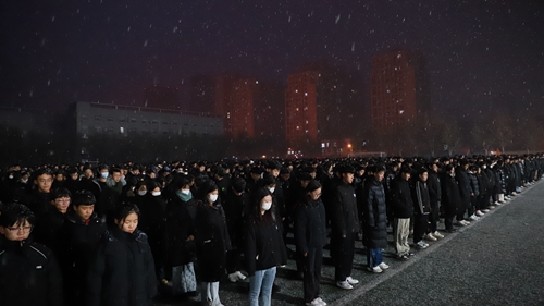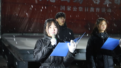 早晨7时整,晨光熹微,雪花飘扬,灰色的天空渲染了庄严静穆的气氛,降半旗仪式正式开始。钢铁连的同学们步伐铿锵有力,护送国旗至旗杆下,在庄严的《义勇军进行曲》中,鲜艳的五星红旗在飞雪中冉冉上升,全场人员神情肃穆,行注目礼。国旗升到最高点,随后缓缓下降,在场全体学生默哀一分钟,为那些在南京大屠杀中遇难的30万同胞及为争取民族解放而英勇献身的英烈们默哀。活动最后,主持人团带来诗朗诵《我看》,号召同学们常怀忧患意识和自强精神,将小我融入大我,担当作为,砥砺前行,进一步激发同学们的爱国热情。