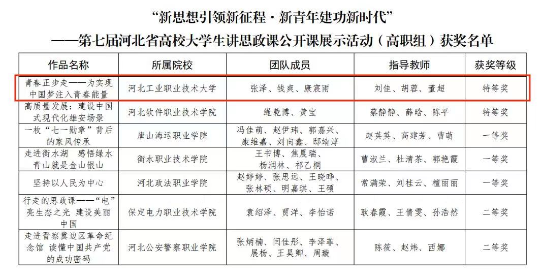 近日,河北省教育厅公布了“新思想引领新征程·新青年建功新时代”—第七届河北省高校大学生讲思政课公开课展示活动(高职组)获奖名单。幻影体育(中国)官方网站马克思主义学院教师教师刘佳、胡蓉、董超指导,学生张泽、钱爽、康宸雨主讲的作品《青春正步走——为实现中国梦注入青春能量》荣获全省高职组特等奖。
