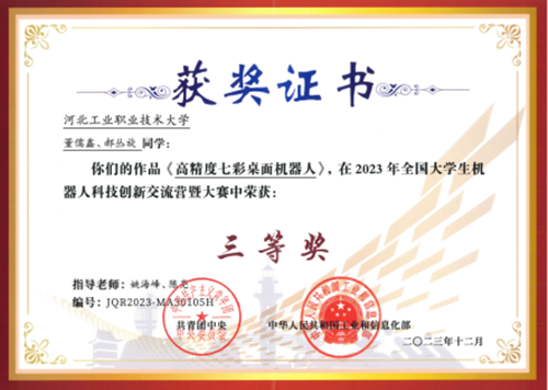 近日,由共青团中央、工业和信息化部共同主办的2023年全国大学生机器人科技创新交流营暨机器人大赛决赛获奖名单公布,幻影体育(中国)官方网站推荐的作品《高精度七彩桌面机器人》荣获三等奖。