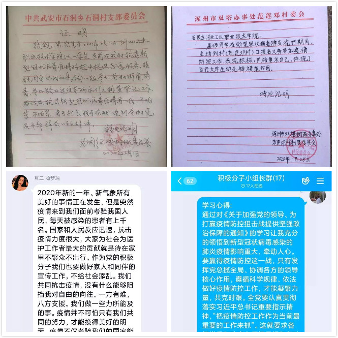 在这场抗“疫”之战中,工院青年学子们在做好自身安全防护的情况下,主动向社区请战,就近编入青年突击队,发挥青年作用。计算机技术系多名学生发挥专业特长,他们有的帮助村委会整理数据,制作出入人员登记表、疫情日报表等,有的利用专业知识帮助村委会录入居民全面普查登记表、用CAD进行构图排查外来人口的具体来源。汽车工程系17级汽修一班王士通,作为大学生预征对象志愿者主动积极参与中国人民解放军陆军某单位,紧急集中为武汉医护人员整理、搬运物资的任务,连续三日无休,他说“在抗击疫情的过程中我看到了无数奋战一线的军人,深受感触,这也是我的一次热血青春,能够为国家出力,非常自豪!”经济贸易系17级市场营销班于雪娇,作为一名共产党员,她看到在寒冷的冬天挺身而出、义无反顾奋战在疫情防控一线的基层干部,便用自己勤工俭学的钱托爸爸的朋友买到了一千副一次性手套捐献给村党支部。智能制造学院多名学子收到了当地村委会的书面表扬,他们主动请缨,担任村镇“排查员”“安检员”和“运送工”,以己之力投身到这场没有硝烟的战斗中去。工商管理系发挥学生党员、团员作用,他们集体亮出身份,统一学习全国疫情防控战的重要精神指示,在线上进行学习打卡交流,并参与到家乡的志愿者行动中。环境与化学工程系19级环境工程技术1班李艺硕过了大年初三就和村里的“硬核”大爷们一起抗疫,变成村里的“拦路虎”,登记进出人员,劝阻村民防疫关键时期不要走亲访友,担当“宣传员”挨家挨户发放防疫宣传单,确保每天早上八点准时打开村里的大喇叭,播放防控知识。建筑工程系19级室内设计1班的王治文同学每天随党员爸爸去社区值班防疫,参加了社区的入户疫情排查、小区防控值守、悬挂宣传条幅、社区公共区域消毒等工作。材料工程系19级新能源班赵博浩第一时间响应号召请愿参与村镇志愿者行动,他说“充分相信国家和党的力量,我们不信谣不传谣,要光荣地成为一名抗击疫情的青年志愿者,为祖国尽一份力。”