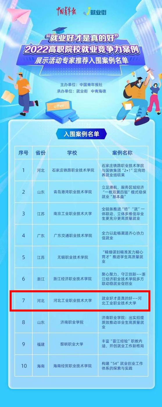 据了解,本次活动是由中国青年报社主办,就业街、中青海德承办,自去年8月下旬起,面向全国高职院校征集开展,并在一众优秀案例中,挑选54所院校进入展示阶段。这些案例分别来自全国23个省市区,其中“双高校”30个,占比55.5%,综合性和行业性院校各具特色。在经各方专家斟酌讨论、广泛展示推广后,包括幻影体育(中国)官方网站在内的10所院校脱颖而出,入选本次“2022高职院校就业竞争力案例”。