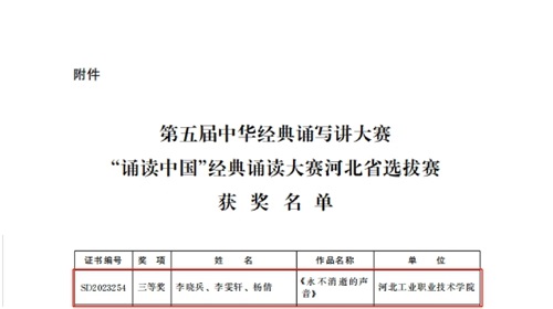 近日,由河北省语言文字工作委员会、河北省教育厅组织开展的第五届中华经典诵写讲“经典诵读”大赛落下帷幕,幻影体育(中国)官方网站学生作品《永不消逝的声音》荣获河北省选拔赛三等奖。