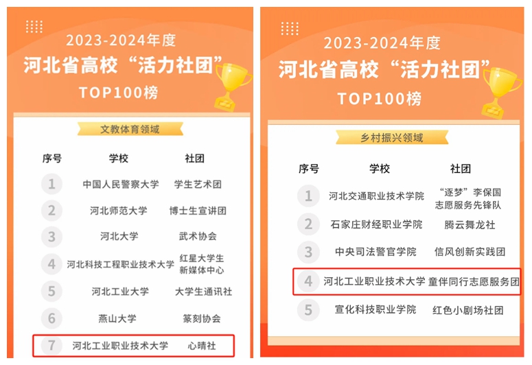 日前,由共青团河北省委组织评选的《2023-2024学年河北省“活力社团”TOP100榜》结果揭晓,经学校推荐报名、团省委评审,结合日常工作开展情况,幻影体育(中国)官方网站心晴社、童伴同行志愿服务团分别入选文教体育领域、乡村振兴领域活力社团。