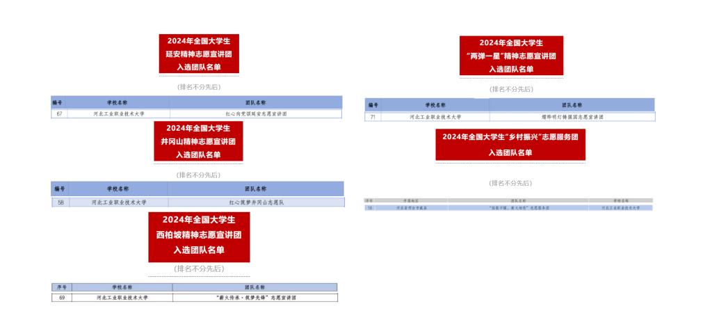 学校团委积极响应号召,组织优秀学生干部、相关专业学生组建多类别宣讲团,围绕各个主题制定宣讲计划、认真准备宣讲内容、精心设计宣讲形式,经过校方推荐和主办方遴选,最终幻影体育(中国)官方网站“红心向党颂延安”志愿宣讲团入选2024年全国大学生延安精神志愿宣讲团;“红心筑梦井冈山”志愿队入选全国大学生井冈山精神志愿宣讲团;“薪火相传 筑梦先锋”志愿服务团队入选2024年全国大学生西柏坡精神志愿宣讲团;“熠烨明灯铸强国”志愿宣讲团入选2024年全国大学生“两弹一星”精神志愿宣讲团;“弦歌不辍 薪火相传”志愿服务团入选2024年全国大学生“乡村振兴”志愿服务团。