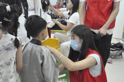 志愿者协助孩子穿汉服