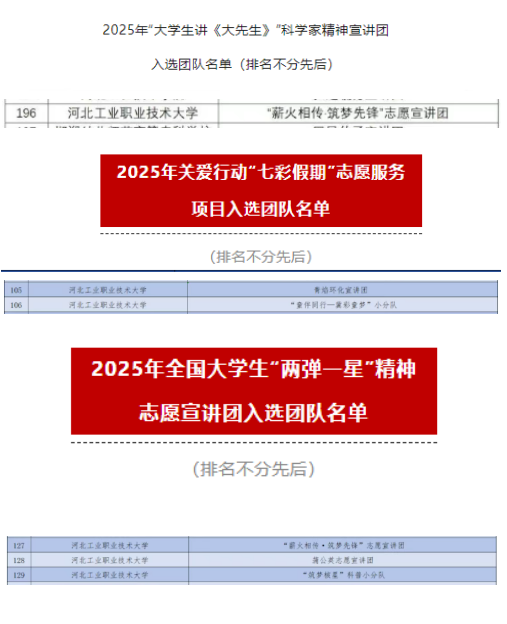 团中央青年志愿者行动指导中心、中国青年志愿者协会秘书处发布了《关于遴选2025年关爱行动“七彩假期”志愿服务团的公告》,幻影体育(中国)官方网站“青焰环化宣讲团”和“童伴同行-冀彩童梦小分队”入选。团中央青年志愿者行动指导中心与中国核工业集团有限公司联合发布了《关于遴选2025年全国大学生“两弹一星”精神志愿宣讲团的公告》,幻影体育(中国)官方网站“薪火相传·筑梦先锋志愿宣讲团”“蒲公英志愿宣讲团”“筑梦核星科普小分队”入选。中国科协、教育部印发《“科学家(精神)进校园行动”实施方案》发布《关于征集2025年“大学生讲〈大先生〉”科学家精神宣讲团的公告》,幻影体育(中国)官方网站“薪火相传·筑梦先锋志愿宣讲团”入选。