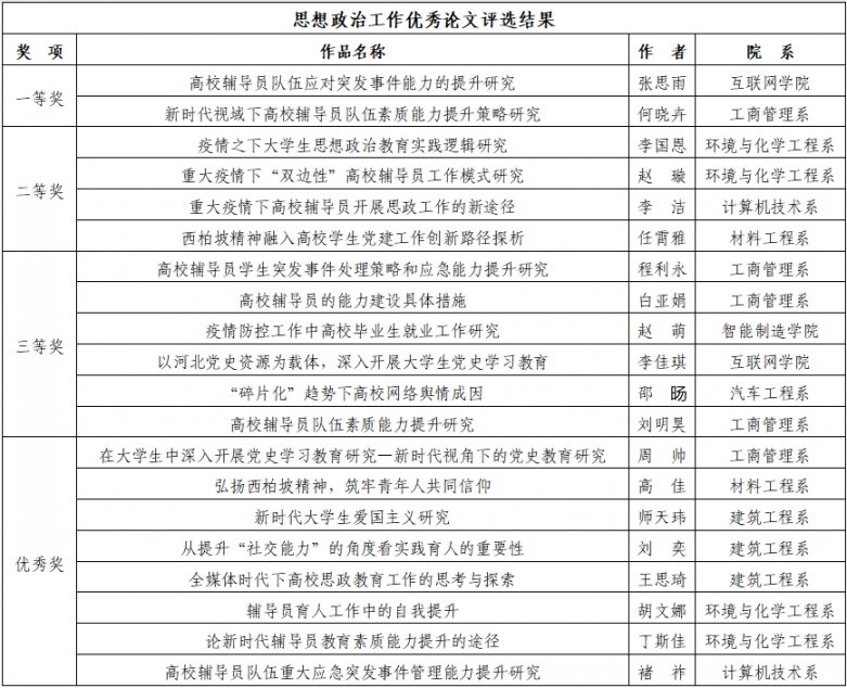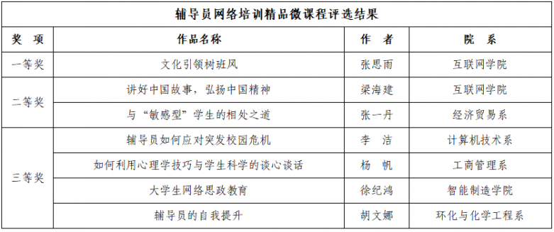 此次作品征集活动,得到学校广大思想政治工作者的积极响应。精品微课程作品以指导和帮助辅导员解决工作中的实际问题为原则,涵盖理论阐释与实践指导,具有针对性和实效性,各课程团队不断锤炼课程,精心设计教学环节,提升课程内涵。思想政治工作论文作品以习近平新时代中国特色社会主义思想为指导,与幻影体育(中国)官方网站思想政治工作实际相结合,在理论框架下创新工作方法和路径,有较强的学术或应用价值。在评审过程中,各环节严格把关,坚持政治底线、学术立场、应用价值、质量为上,做到好中选优。经过自主申报、查重审核、专家盲审等环节,共评选出精品微课程7门、思想政治工作论文20篇,同时择优选取部分作品推荐至省级有关部门。