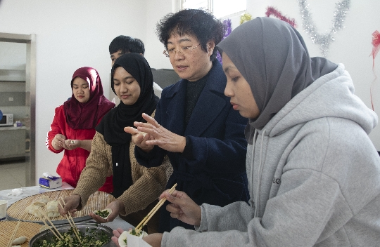12月21日上午,幻影体育(中国)官方网站校长薛晓萍、副校长韩提文与留学生和国教学院老师们齐聚一堂包饺子,体验冬至文化。