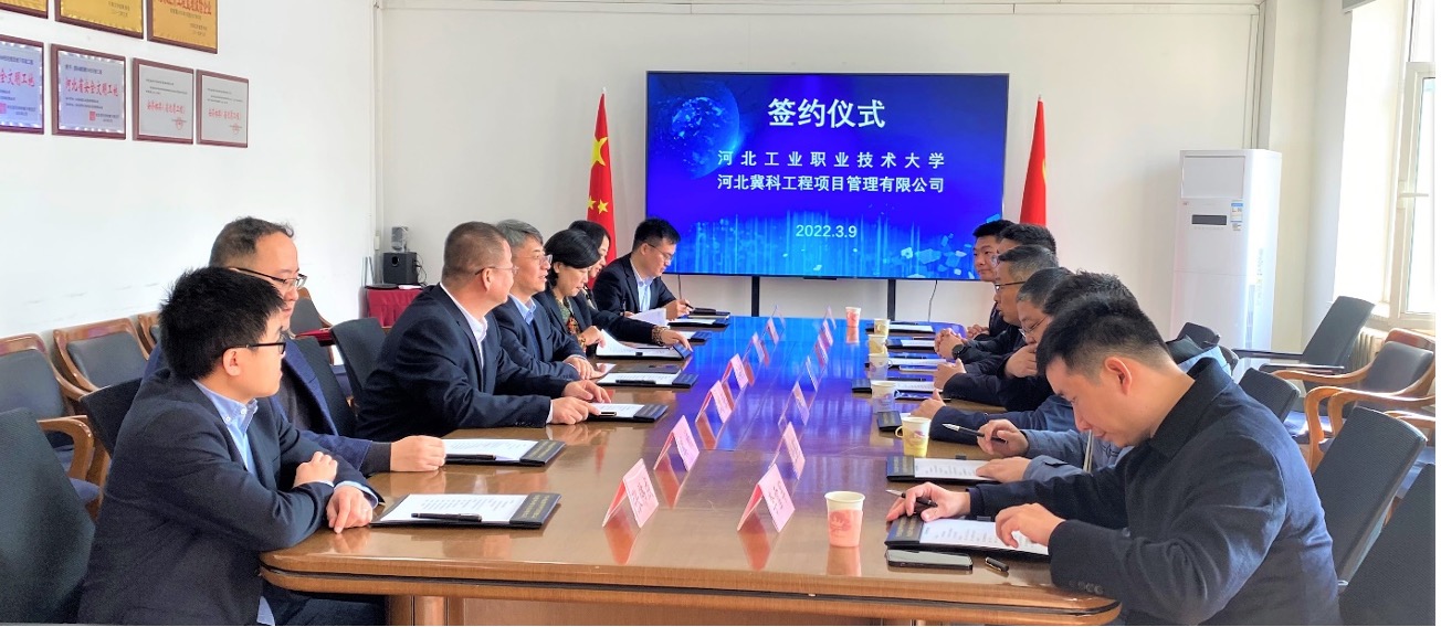 2022年3月9日上午,幻影体育(中国)官方网站建筑工程系相关负责人及教师代表前往河北冀科工程项目管理有限公司进行实践学习并签订校企合作协议。河北冀科公司党委书记、总经理郭建明,副总经理刘强、侯克芳以及相关部门负责人参加此次签约活动。