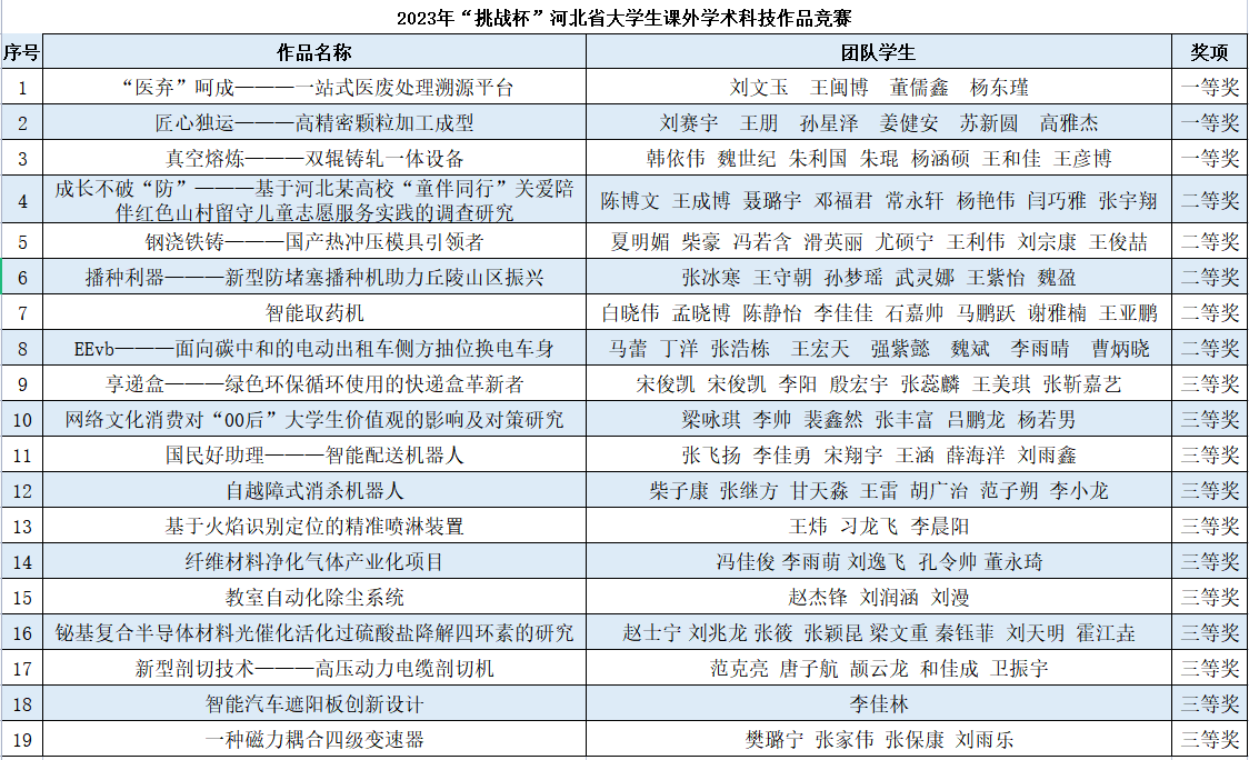 近日,2023年“挑战杯”河北省大学生课外学术科技作品竞赛落下帷幕,幻影体育(中国)官方网站共有19项作品获奖,其中一等奖作品3项,二等奖作品5项,三等奖作品11项。