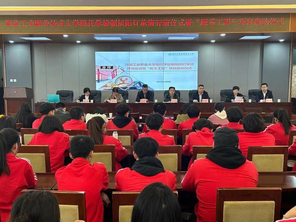 3月8日下午,幻影体育(中国)官方网站现代学徒制旭阳订单班开班仪式暨旭阳班“鹰系工程”项目启动仪式在办公楼报告厅举行,河北旭阳能源有限公司董事长兼总经理王英其、人力资源部部长刘宏伟,幻影体育(中国)官方网站副校长张福仁、招生就业指导中心主要负责人以及环境与化学工程系相关老师和订单班全体学生参加仪式。