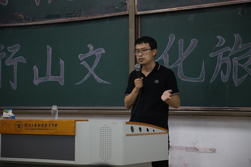 魏飞向同学们详细介绍了太行山独特的地理位置。太行山以东为“华北平原”,以西为“黄土高原”,绵延数百公里,自然资源得天独厚,文化积淀深厚。魏飞借用李白、杜甫、白居易、苏轼等文人墨客的不朽诗作、中国伟大的思想家孔子曾在此隐居习字的传说故事,以及一组组美轮美奂的太行山脉照片,生动地向同学们展示了丰富多彩的太行山旅游文化,从地产、物产、史前、非遗文化等十个方面,多层次、全方位地描绘了太行山文化的多样性,激发了同学们对太行山文化旅游带的浓厚兴趣。