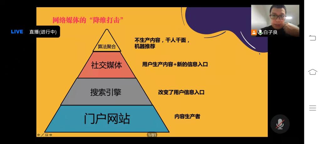 随着新媒体的普及,青年群体利用各种新媒介形态进行亚文化实践,构建了属于这个时代的青年亚文化景观。11月18日晚,新闻宣传中心白子良老师以“新媒体与青年亚文化”为主题,开展线上讲座,引领同学们思考新媒体与青年亚文化之间的关系。