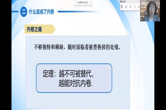 在本次讲座中,刘老师首先从数学博弈、工作加班“注水”、囚徒困境等例子入手导入本次讲课的主题——“内卷”,然后,她通过数学函数展示了收益与付出的关系,形象地介绍了“内卷”的形成与发展状态,随后阐述了数学中的两个定量:越不可替代,越能对抗内卷;跨维度比较,会削弱不可替代性,更加容易被内卷,进而引出了抵抗“内卷”的具体办法。最后她指出,一个国家的教育,必须跟经济、市场、产业结构相适应,最后,她鼓励同学们不断学习专业知识,积极参加学校、院系、专业和跨学院、跨专业的培训、讲座等,开阔视野,并寄语大家“道阻且长,行则将至,行而不辍,未来可期”。