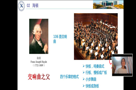 胡老师首先向同学们概述了维也纳古典乐派的伟大成就。接着,胡老师通过讲述乐派中最具代表性的三位音乐家海顿、莫扎特、贝多芬的生活经历、创作历程和代表作品,展现了作为“交响乐之父”海顿106首交响曲、80多首弦乐四重奏、30多部歌剧不同类型作品中多变的创作风格,“音乐天才”莫扎特将人生苦难化为清新、明快、开朗音乐作品的创作历程,以及作为古典主义风格集大成者、浪漫主义风格开创者的音乐家贝多芬,虽然在晚年双耳失聪但依旧谱写出宏伟音乐篇章对后世产生深远影响,通过带领同学们鉴赏《小步舞曲k1》《“牛津”交响曲》《命运交响曲》等三位音乐节的代表作,让同学们领略了维也纳古典主义音乐的艺术感染力和高超作曲技法。