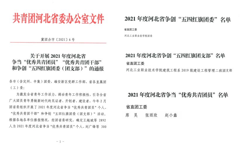 近日,共青团河北省委下发的《关于开展2021年度河北省争当“优秀共青团员”“优秀共青团干部”和争创“五四红旗团委(团支部)”的通报》中,幻影体育(中国)官方网站团委荣获“河北省五四红旗团委”荣誉称号。建筑工程系2019级建设工程管理二班团支部被评为“河北省五四红旗团支部”,幻影体育(中国)官方网站三名学生获“河北省优秀共青团员”称号。