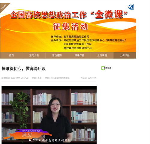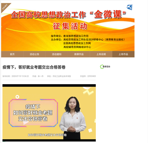 两部微课作品中,互联网学院张一丹老师的《疫情下,答好就业考题交出合格答卷》,把疫情这场席卷全国的“特殊战役”中的素材转化为实用而鲜活的教材,从就业形势、国家政策、求职技巧三个方面入手,分析了就业层面“危”中有“机”,并结合疫情背景,提出不同以往的求职侧重点,为学生的思想注入引领动力。引导学生感受到中国特色社会主义制度优越性的同时,能够确立正确的人生观价值观就业观,从容应对、顺利就业,交上抗疫大考的“青春答卷”。新闻宣传中心陈思老师以《捧滚烫初心 做奔涌后浪》为题,以“00后”高考后感到迷茫的状态为背景,结合当前新冠肺炎疫情、近期的严峻汛情以及毕业季习近平总书记的重要回信精神,从迷茫找初心、选择悟初心、奋斗践初心三个方面层层递进,鼓励广大青年投身伟大实践中攻坚克难、顽强斗争,在为人民利益的不懈奋斗中书写人生华章。