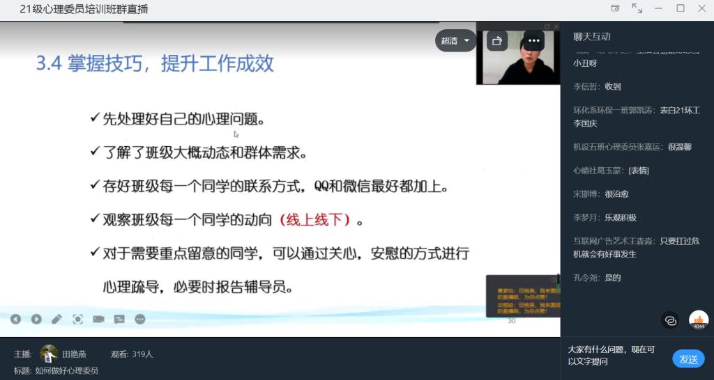 11月11日晚,2021年心理委员培训第二场讲座在钉钉平台线上开展。河北师范大学心理健康指导服务中心主任田艳燕老师为大家带来“如何做好心理委员”专题讲座,2021级各班心理委员、心晴社成员在线聆听。