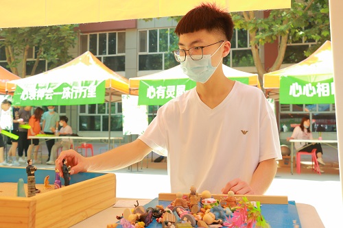 在心晴使者诉说心灵寄语、“阳光心理”笑脸的拼接等环节中,嘉年华打开了序幕。本次活动现场分为体验区、挑战区、探索区。在体验区,“巧涂色彩帮解压”“情绪宣泄有方法”“认识情绪大转盘”等游戏让同学们内心的情绪压力得以释放。在挑战区,“心心相印”背夹球、不倒森林、珠行万里、五人六足、无敌风火轮等游戏,加强同学们的沟通交流,培养团队精神和集体合作意识。在探索区,“神奇卡牌有话说”“感悟一沙一世界”“探索发现你自己”等活动,通过珍爱卡、沙盘游戏、心理测评等,藉由分享、叙说,挖掘内心的积极力量。