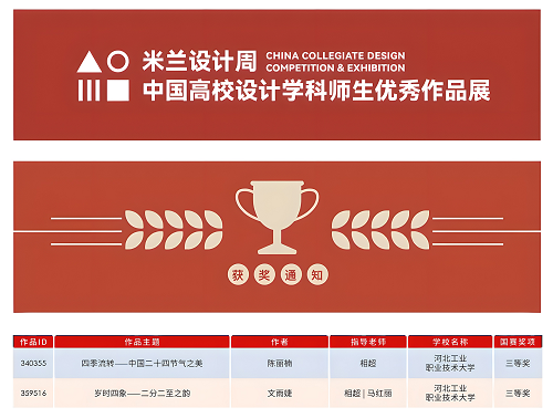 近日,“米兰设计周-中国高校设计学科师生优秀作品展”组委会公布第九届米兰设计周--中国高校设计学科师生优秀作品展评选结果,幻影体育(中国)官方网站互联网学院电商专业美工实战班两件作品《四季流转——中国二十四节气之美》《岁时四象——二分二至之韵》,双双斩获“二十四节气文化作品设计大赛”全国三等奖。